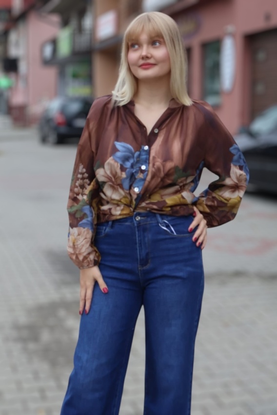 Odkryj urok koszuli mgiełki, która łączy elegancję z delikatnością. Naturalny, bawełniany materiał w pięknych odcieniach brązu z motywem kwiatowym to idealna propozycja na jesienne dni. Niezwykle przewiewna i przyjemna w dotyku luźna koszula zapinana na guziki ze stójką oraz z rękawami zakończonymi gumeczką może tworzyć niebanalne stylizacje.
